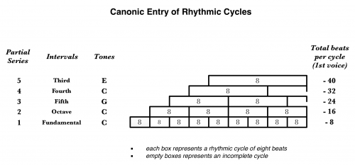 The key to understand the canonic construction and its uniqueness rely in one idea presented in the influential book New Musical Resources (1930) by Henry Cowell. It consists in a way to correspond durations and frequencies where each element in a series of partials multiplies the frequency and the number of rhythmic beats of a given fundamental. In the instance showed by Fig. 2, the second partial of a fundamental 16 Hz plays twice its frequency and its beats, the third partial thrice and so forth. It can also be viewed as an illustration of the mechanism behind the Rhythmicon, a keyboard instrument capable of playing rhythmic ratios with corresponding pitches.